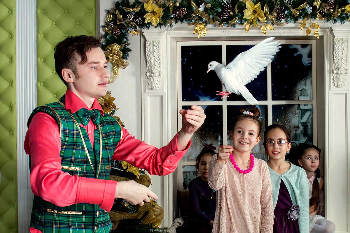 • Волшебник и его друзья «Волшебник и его друзья» Программа на 40-60 минут. Невероятные трюки: Оживающая картина, ведро с монетами, появление кролика, телекинез, голубь из книги, и многое другое...